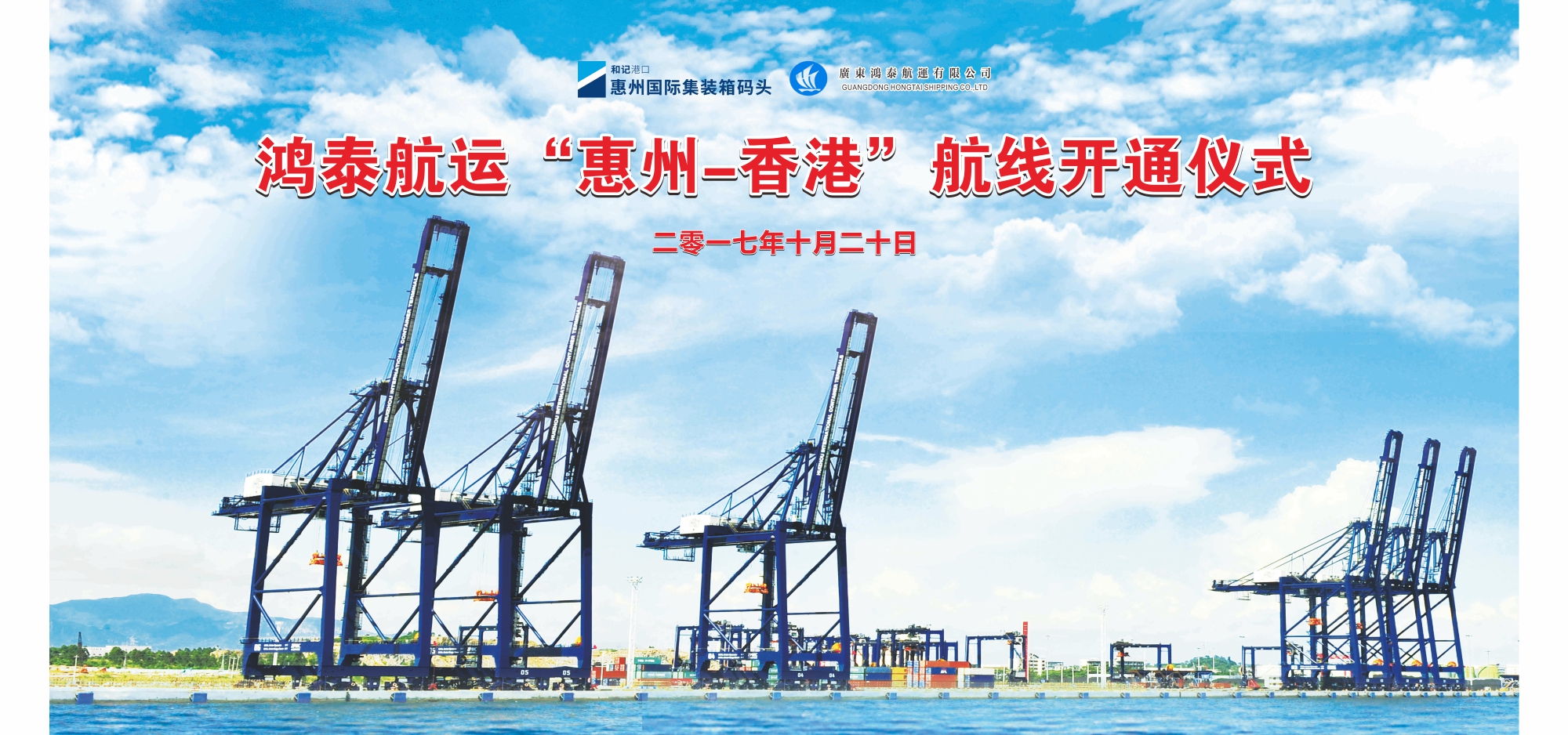 大家好,我是鸿泰航运,刚刚过完了二十岁生日。过去的二十年我专注于做汕头、香港、盐田及蛇口驳船航线,现将服务延伸至惠州。将于2017年10月20日在惠州国际集装箱码头有限公司开通“惠州–香港”驳船航线, 每周周四香港开出,周五惠州开出。该航线为今年开通的第二条香港航线,加之利高驳船航线,国码每周提供三班穏定及优质之服务。