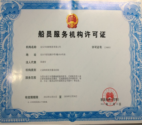 公司已获得船员服务机构许可证,将可提供国内航行中国籍海船提供配员、代理船员用人单位管理海船船员事务,代理海船船员申请培训、考试、办证(海员证和外国船员证书除外)等业务。
