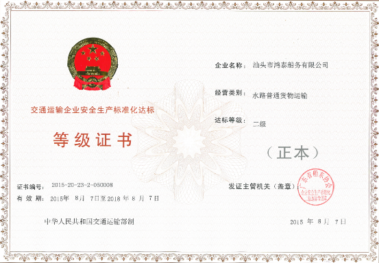 汕头市鸿泰船务有限公司坚持“安全第一,预防为主,科学管理,持续发展”的方针,着力培育企业安全文化,建立安全生产管理长效机制,实现安全生产全面稳定。全面开展安全生产标准化建设,聘请专业人员到企业做安全生产培训,建立安全生产制度文件,对公司已有船舶进行严格管理,确保安全生产零事故发生。经过筹备并制定符合公司实际情况的标准化安全生产制度文件,通过市、省专家的考评,现已取得交通运输部颁发的交通运输企业安全生产标准化达标二级证书。